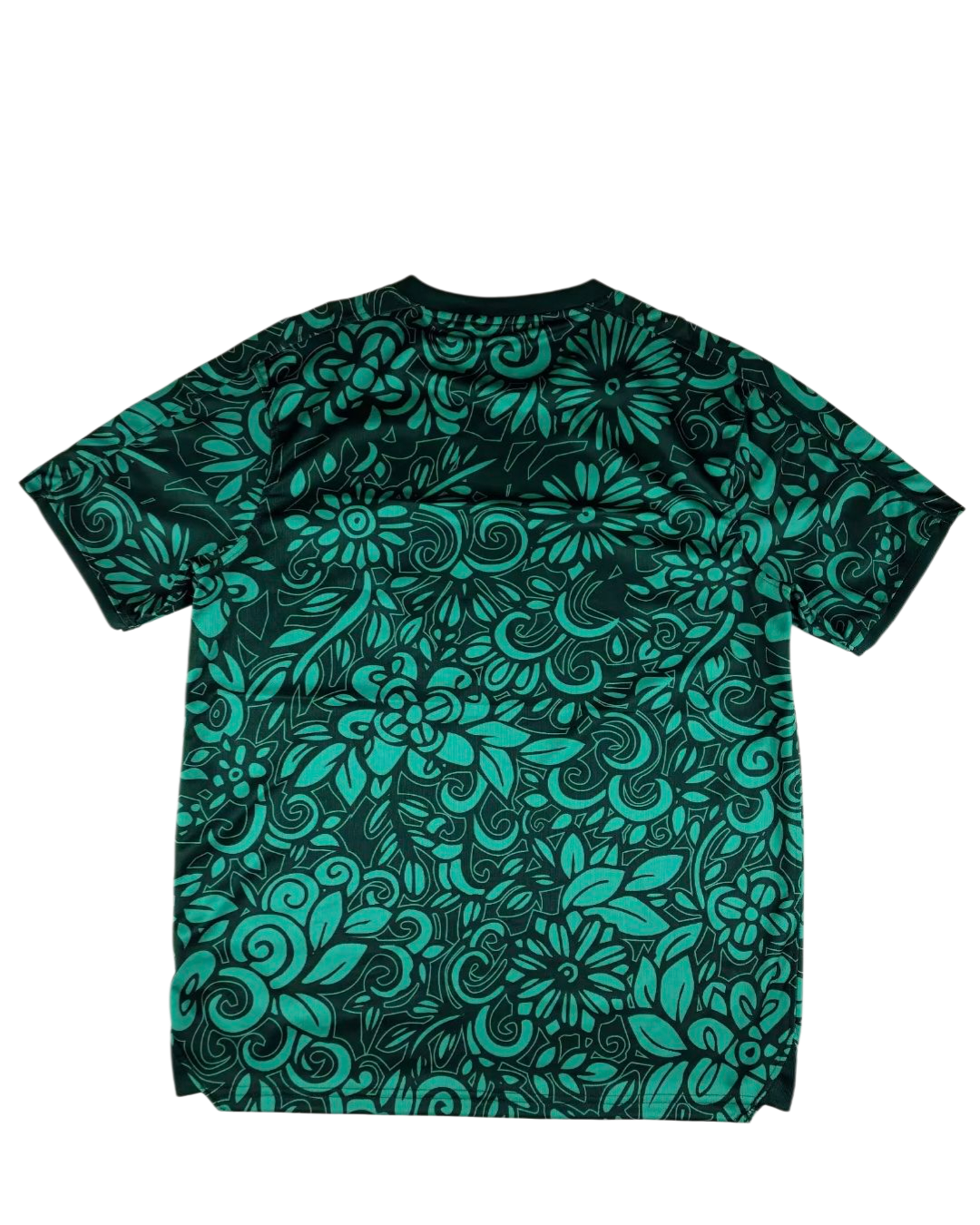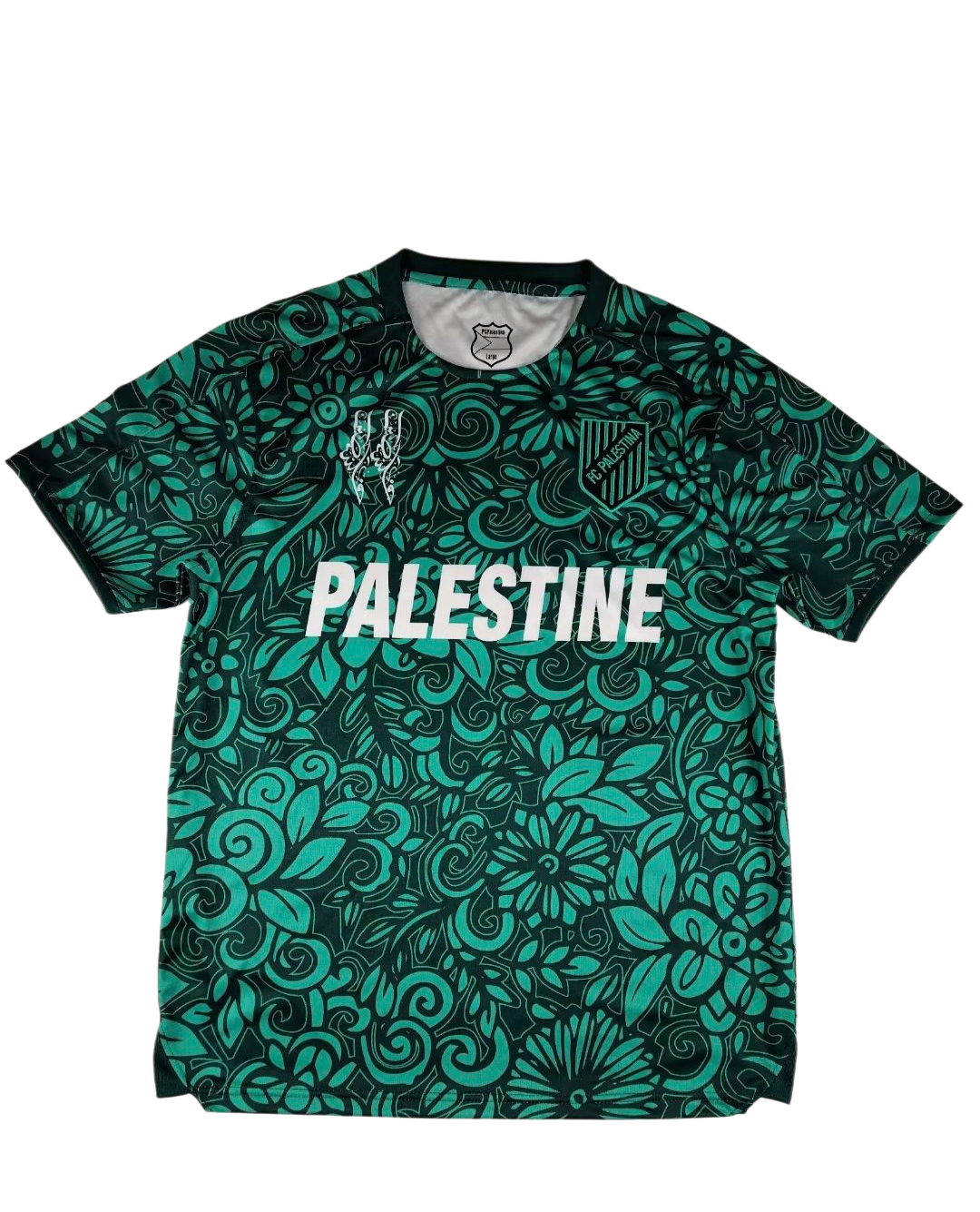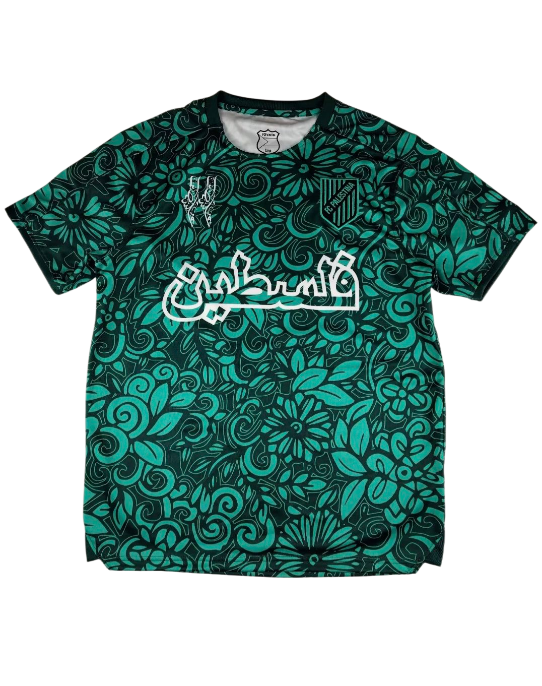 Zeige deine Unterstützung für Palästina mit diesem erfrischenden grünen Fußballtrikot. Das Trikot ist mit einem aufwendigen Muster verziert, das von den traditionellen palästinensischen Tatreez-Stickereien inspiriert ist, die eine reiche Geschichte und kulturelle Bedeutung haben. Die Grundfarbe des Trikots ist ein tiefes Grün, das harmonisch mit einem eleganten hellgrünen Blumen- und Rankenmuster kombiniert ist. Auf der Brust ist der Schriftzug PALESTINE in kräftigem Weiß aufgedruckt, ergänzt durch das Wappen von FC PALESTINE.