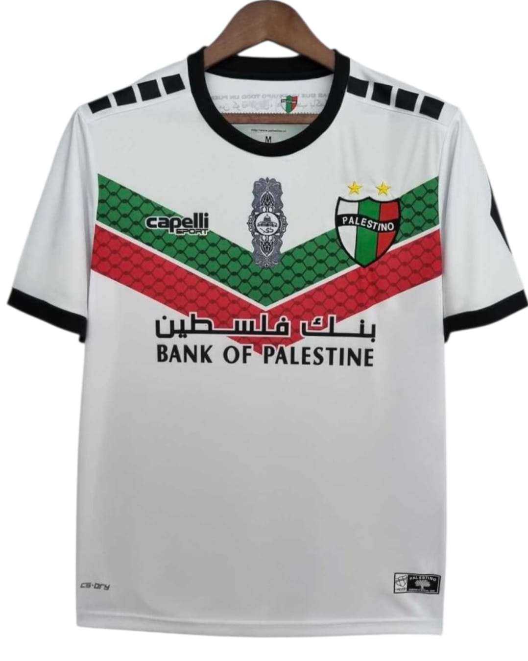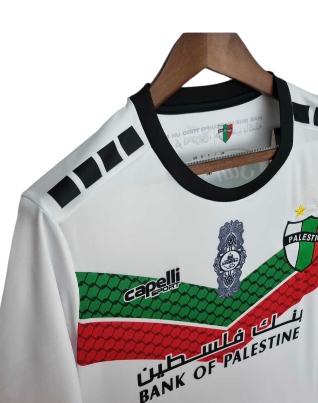 Palästina Heimtrikot in allen Größen mit Vereinslogo, Farben der Flagge und Sponsorenaufdruck Bank of Palestine.